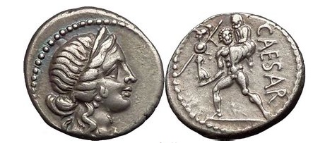L: Venus; R: Aeneas & Anchises (silver denarius minted by Julius Caesar, 47-46 BCE)